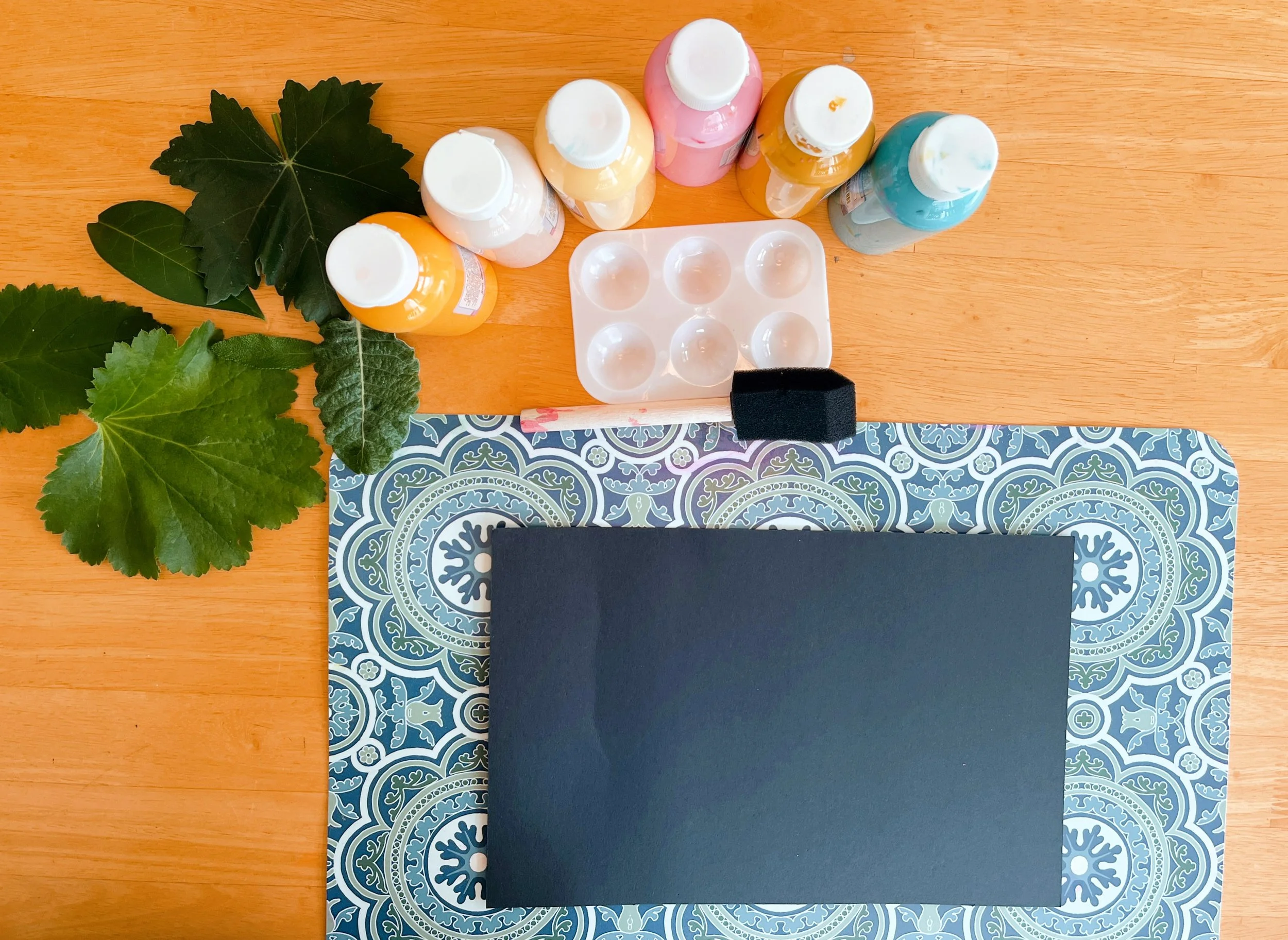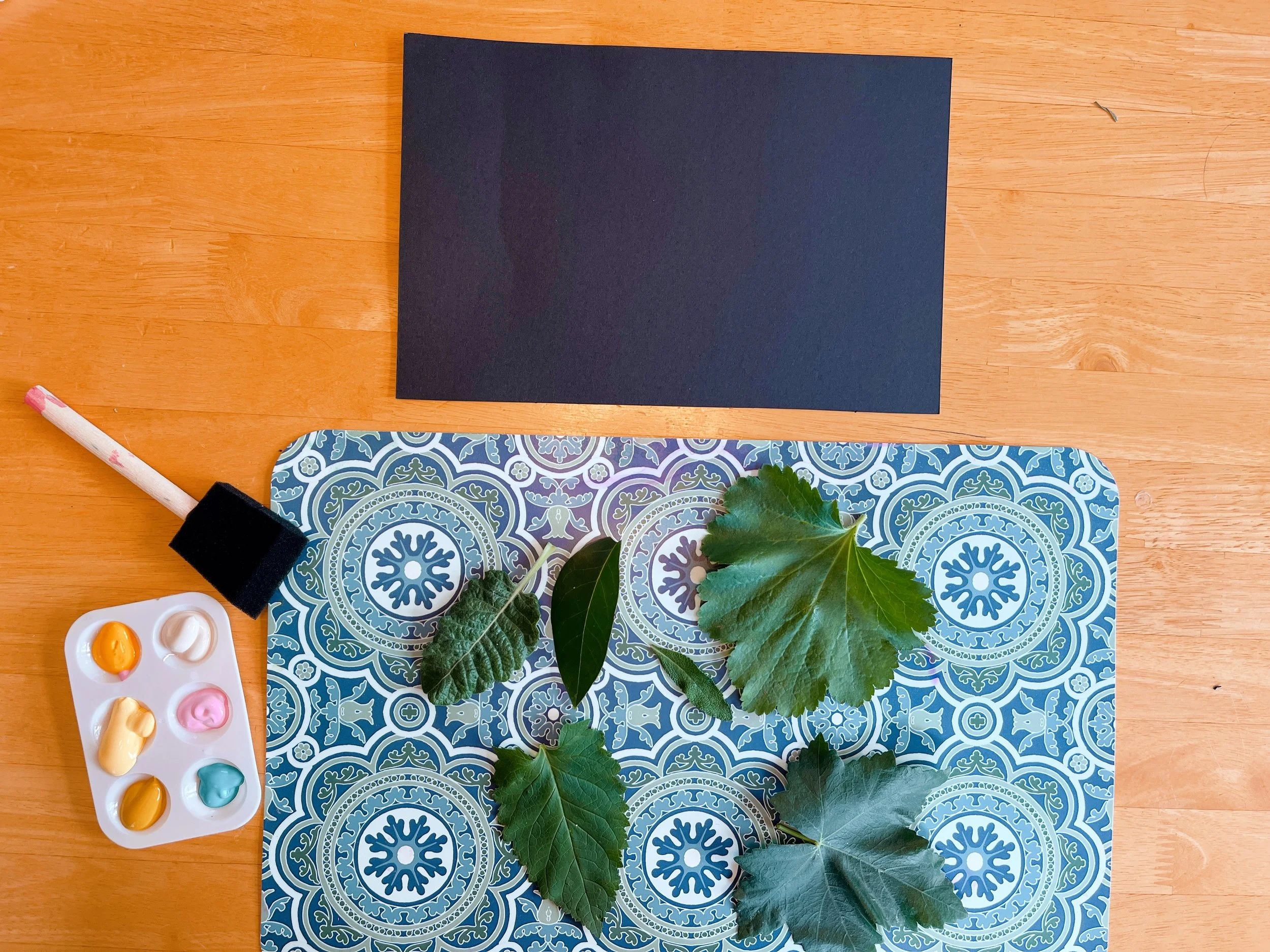 Gather all the supplies needed: Leaves, paint, brush, and paper.