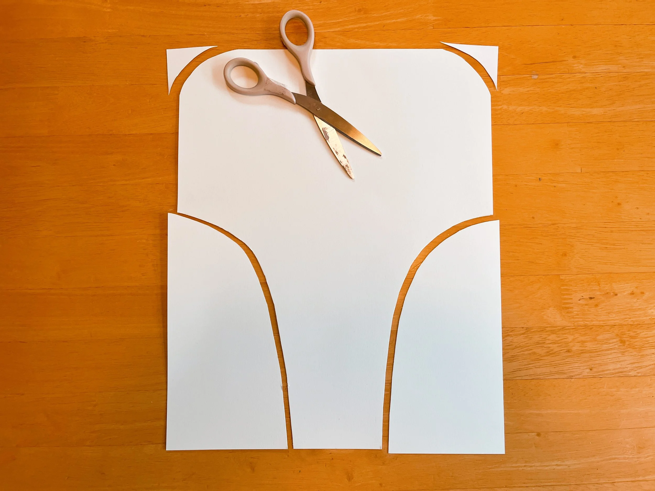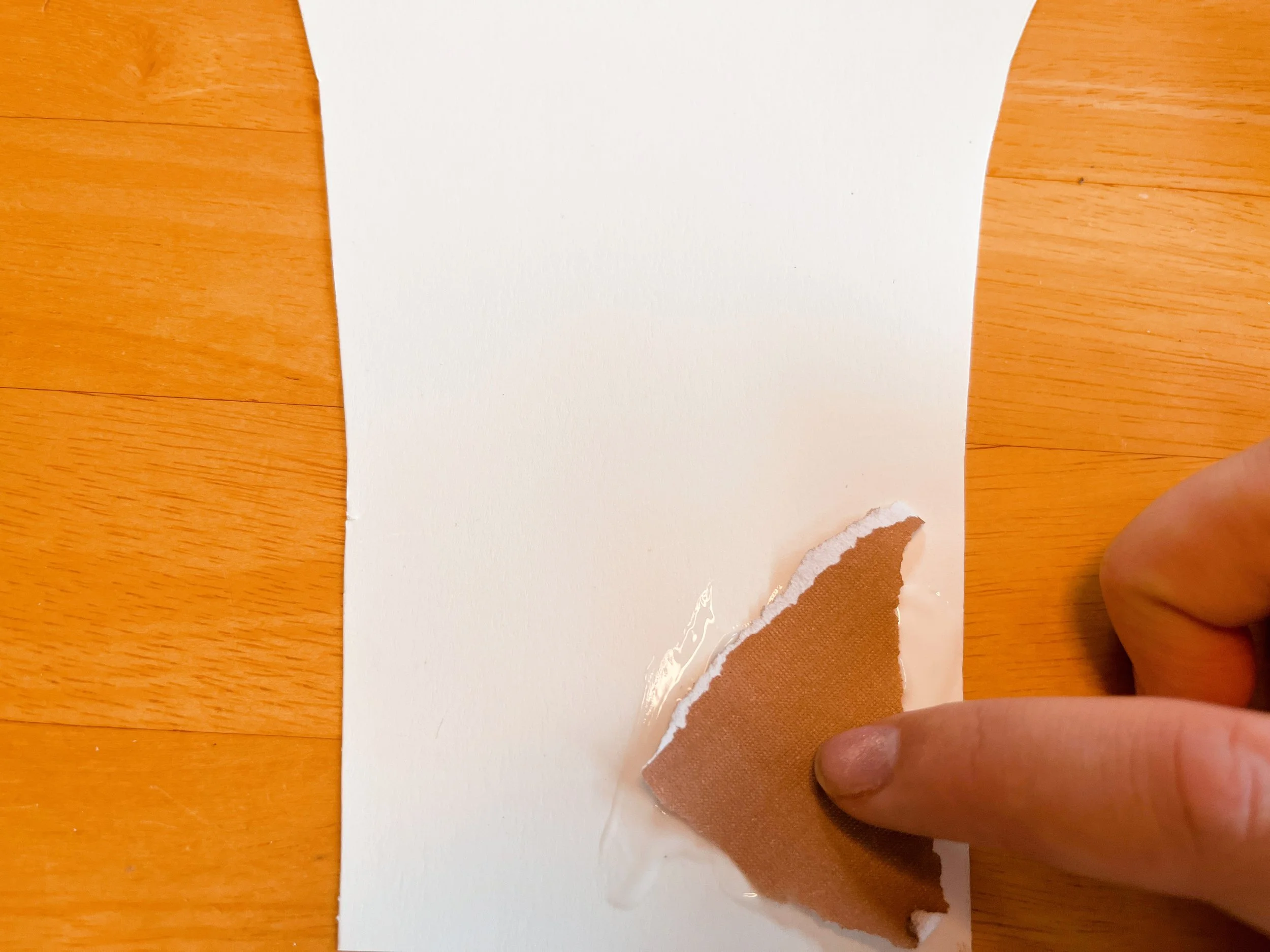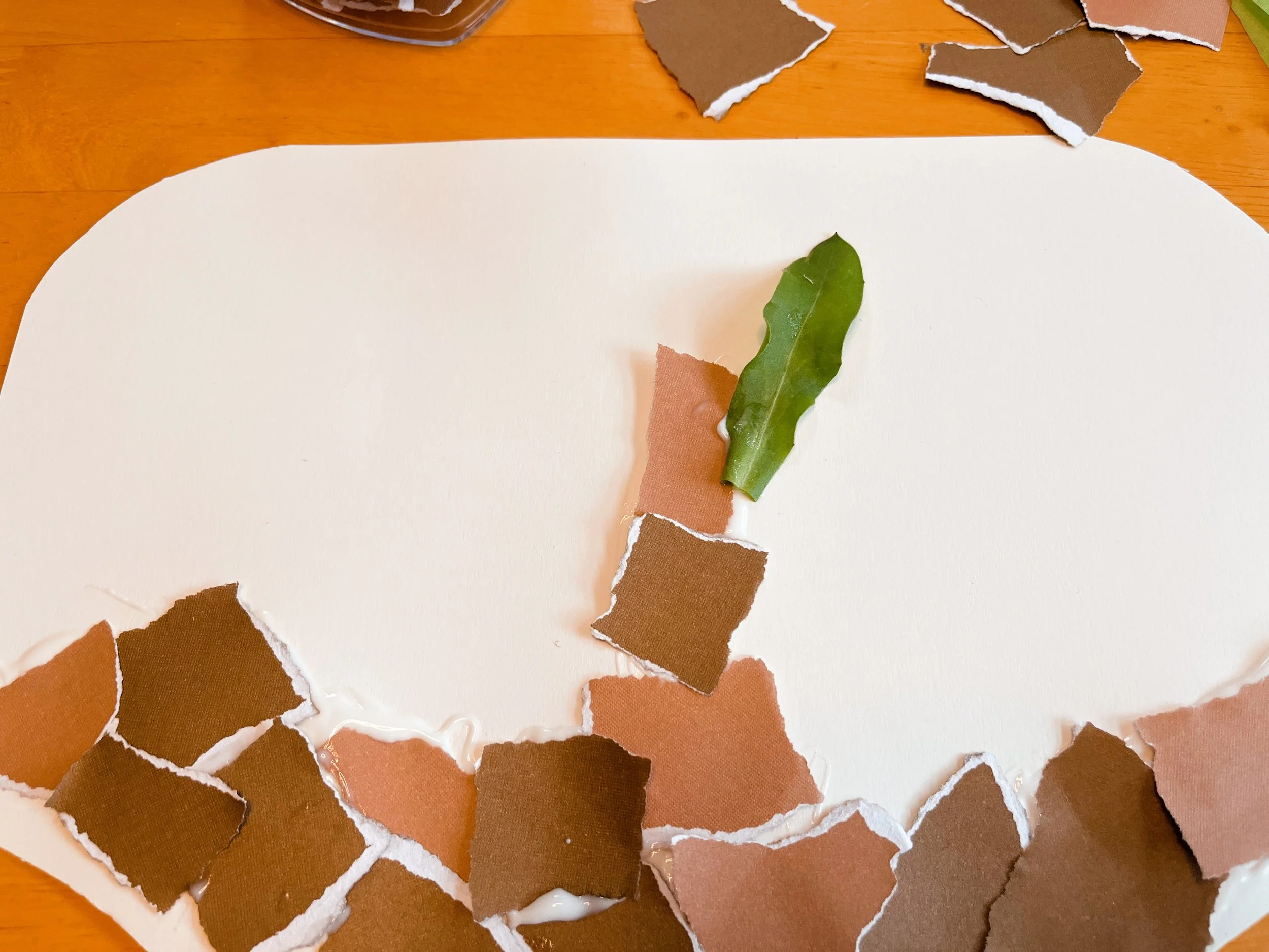 The pieces of brown construction paper are glued onto the trunk area. Repeat this step until the whole trunk is covered with the pieces of paper.
