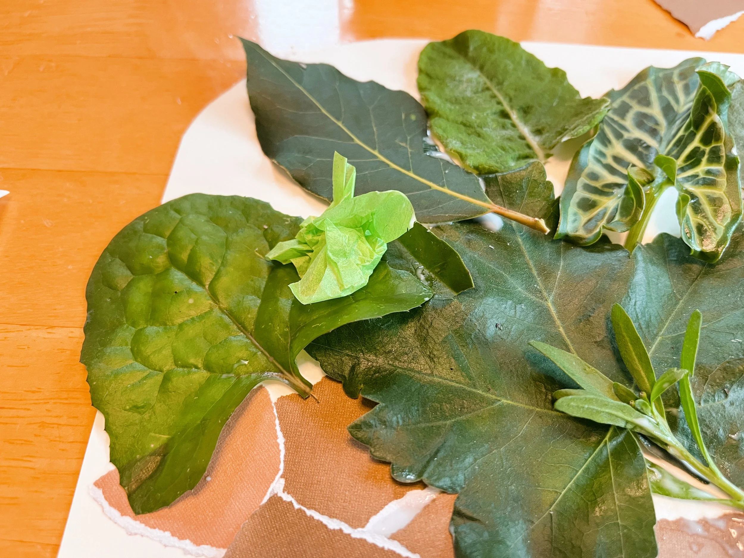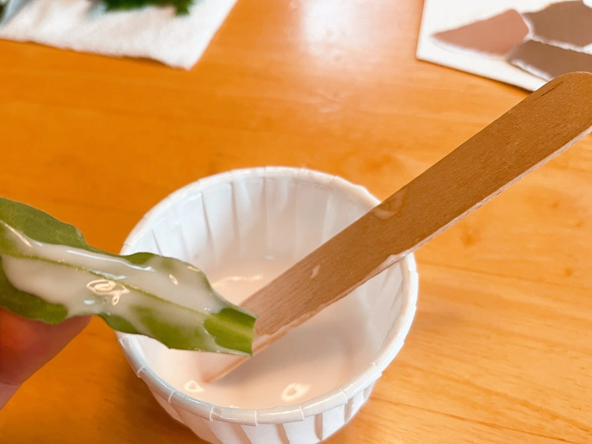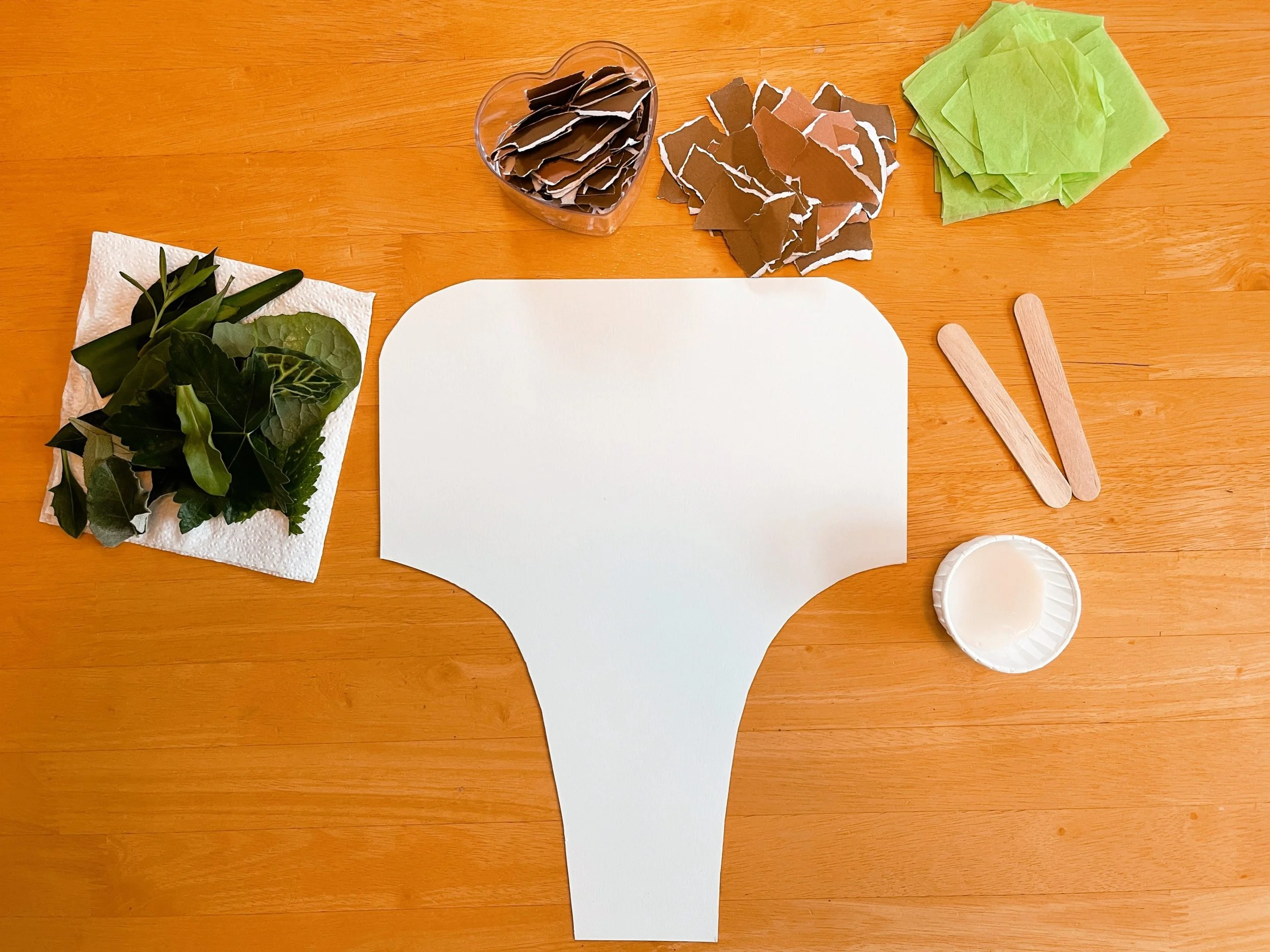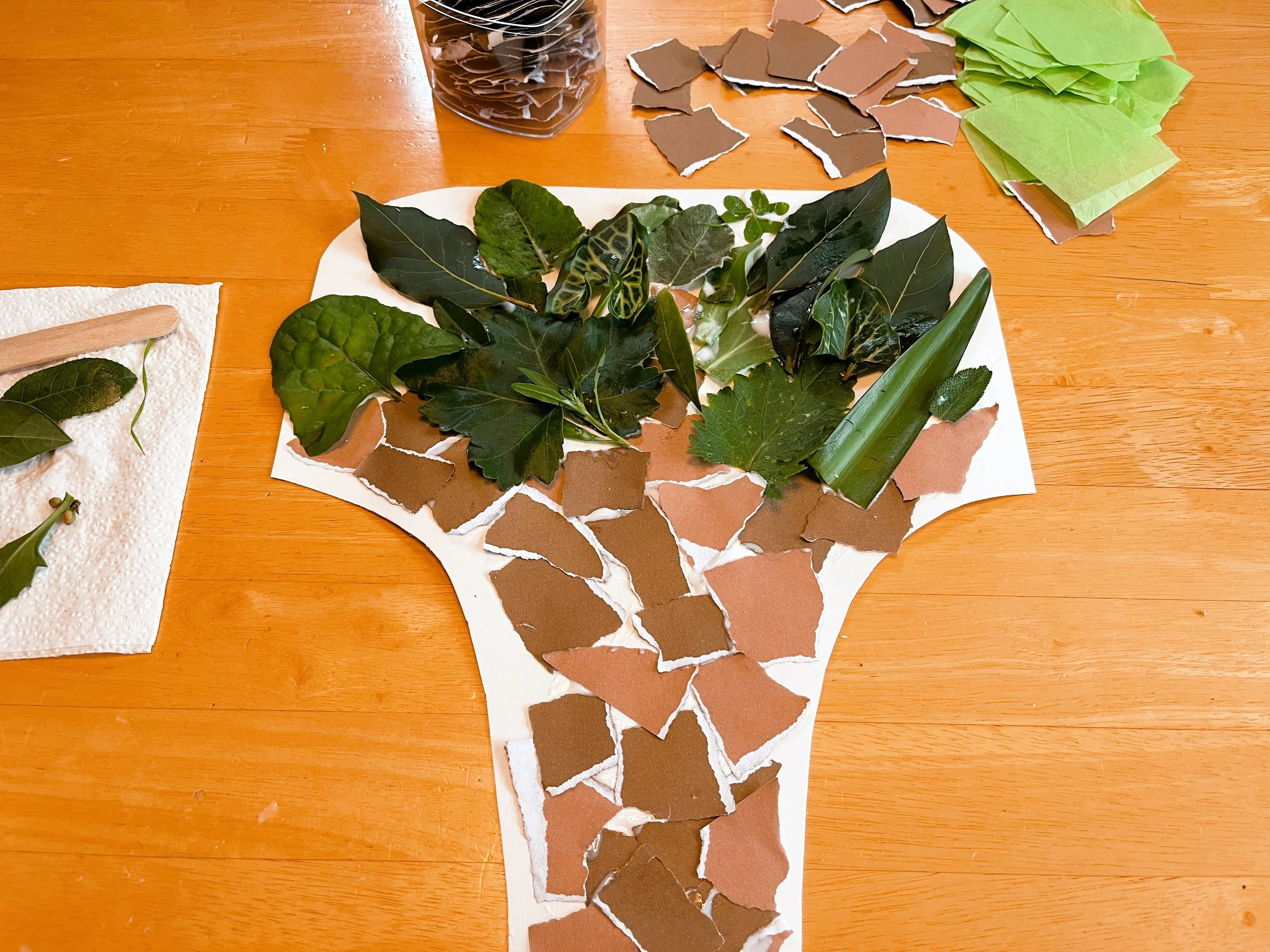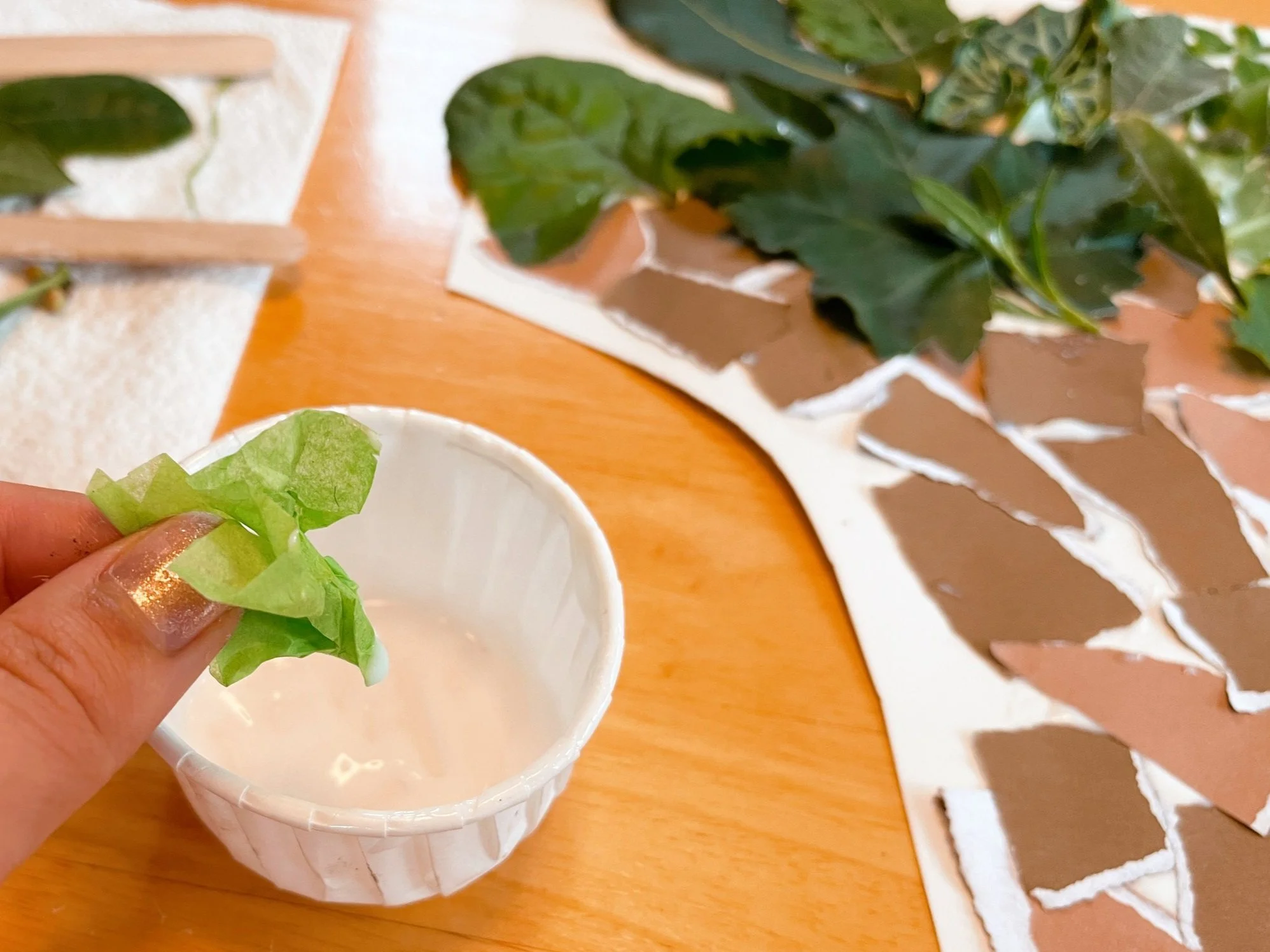 Now it’s time to glue the leaves on! The glue can be put on the leaves using the popsicle sticks.